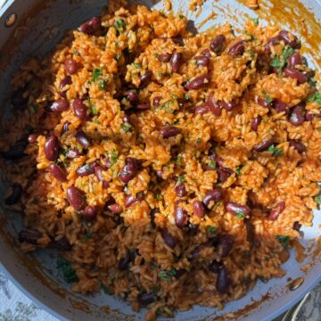A comforting Portuguese arroz de feijão made with simple pantry ingredients and rich tomato flavour. This version is slightly elevated with garlic, pimenta moida, and a splash of Vinho Verde for depth, then simmered until perfectly tender and slightly saucy. Finished with fresh parsley, it is an easy, flavourful side or main that pairs beautifully with grilled meats or chicken.