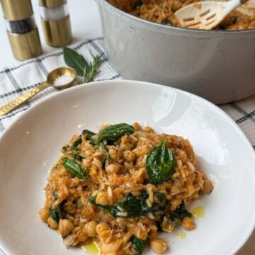 It’s comforting, hearty, and full of that classic Portuguese flavour, but made in one pot, with simple steps, and ingredients I almost always have on hand. The bacalhau cooks right into the rice, the chickpeas make it extra satisfying, and the spinach at the end keeps it fresh and balanced.