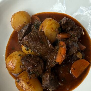 This rich and saucy beef stew is made with tender chunks of flank steak, garlic, red wine, and a flavourful broth that slowly develops as it simmers. Add in carrots and potatoes, and you’ve got a hearty one-pot meal that’s perfect for a cozy family dinner.