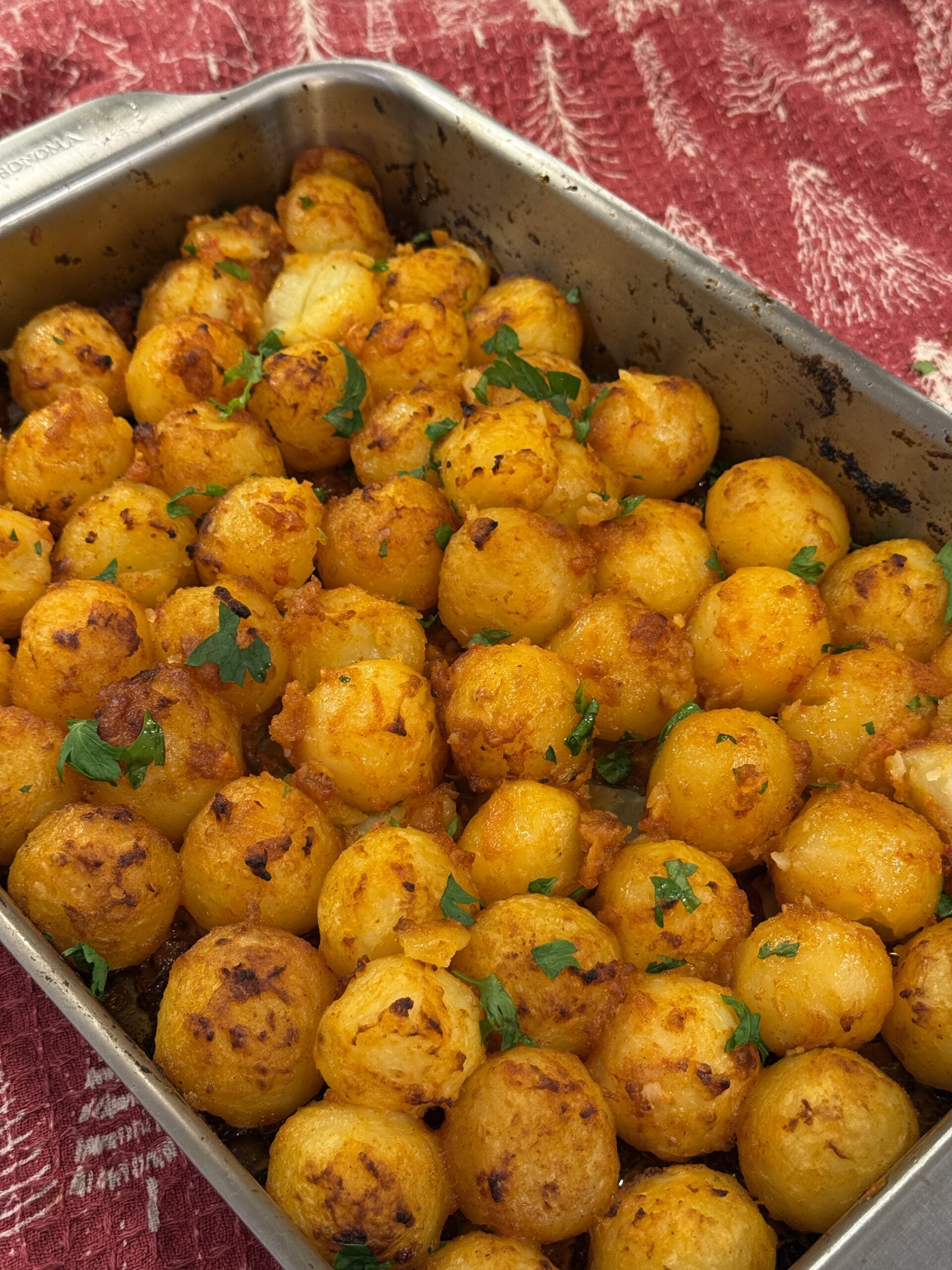 If you cannot find Parisian potatoes, baby potatoes, Yukon Gold potatoes, or fingerling potatoes all work well in this recipe. Just make sure they are cut into similar sized pieces so they cook evenly. Parboiling time may need to be adjusted slightly depending on the size of the potatoes.